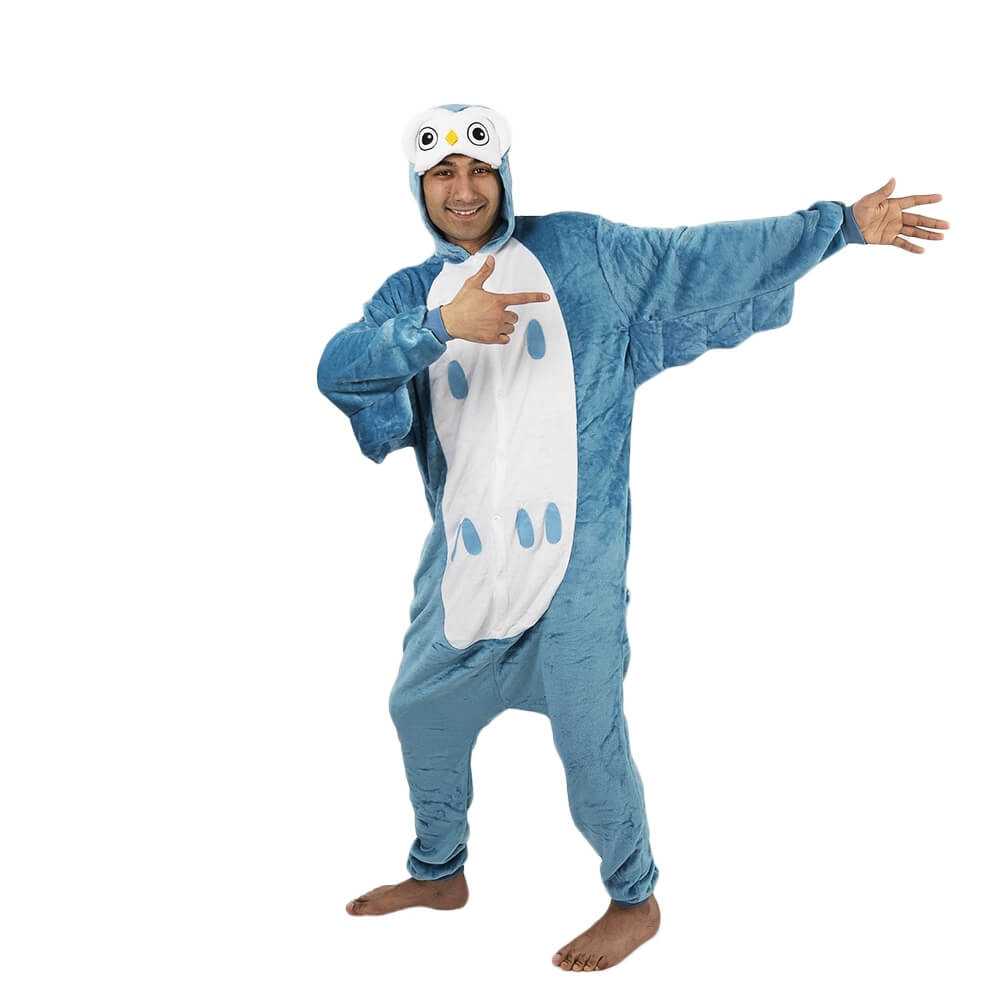 Сова – символ мудрости. Неудивительно, что она становится героем многих фильмов и так нравится детям и взрослым. Предлагаем необычное кигуруми для взрослых – Сова. Оно сшито из мягкой ткани серо-голубого цвета. На капюшоне вышита мордочка, а сзади есть милый хвостик.