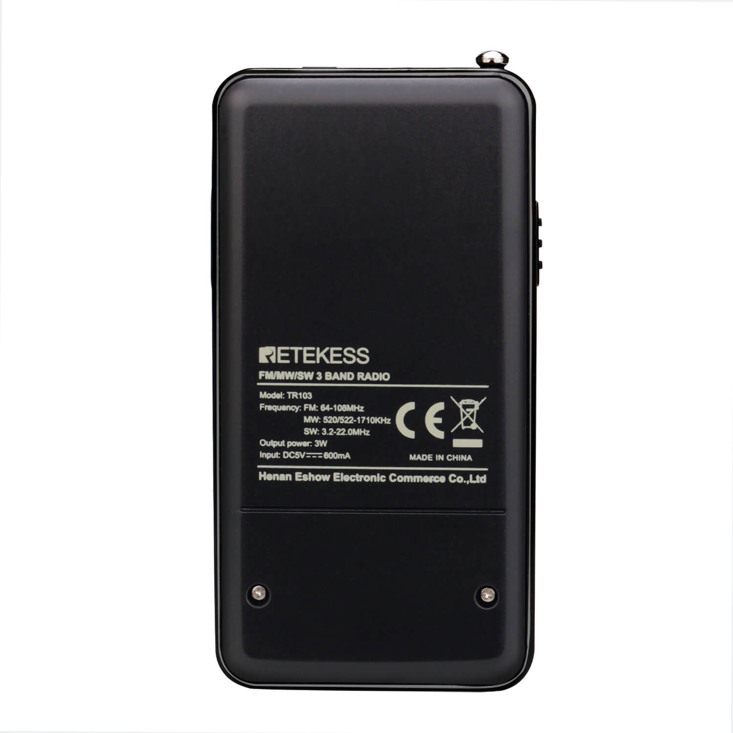 Черный TR103 FM/MW/SW Pocket Radio с разъемом для карты имеет длину антенны в 25 см и выходную мощность 3 Вт. Этот радиоприемник от Retekess идеально подойдет для прослушивания музыки и приема радиостанций в любой обстановке. В комплект также входят кабель для зарядки через USB и руководство пользователя.